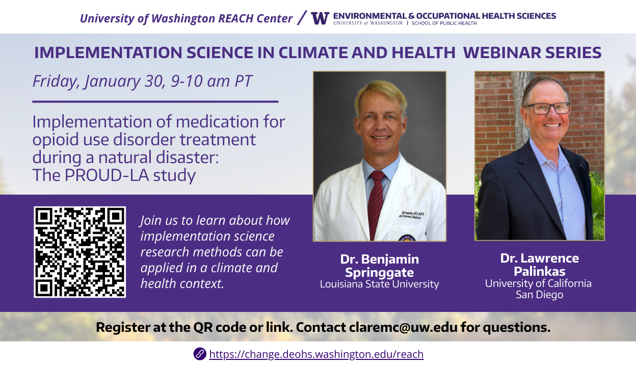 The University of Washington REACH Center is hosting the first webinar in its Implementation Science in Climate and Health Webinar Series on Friday, January 30 from 9-10 am Pacific Time.