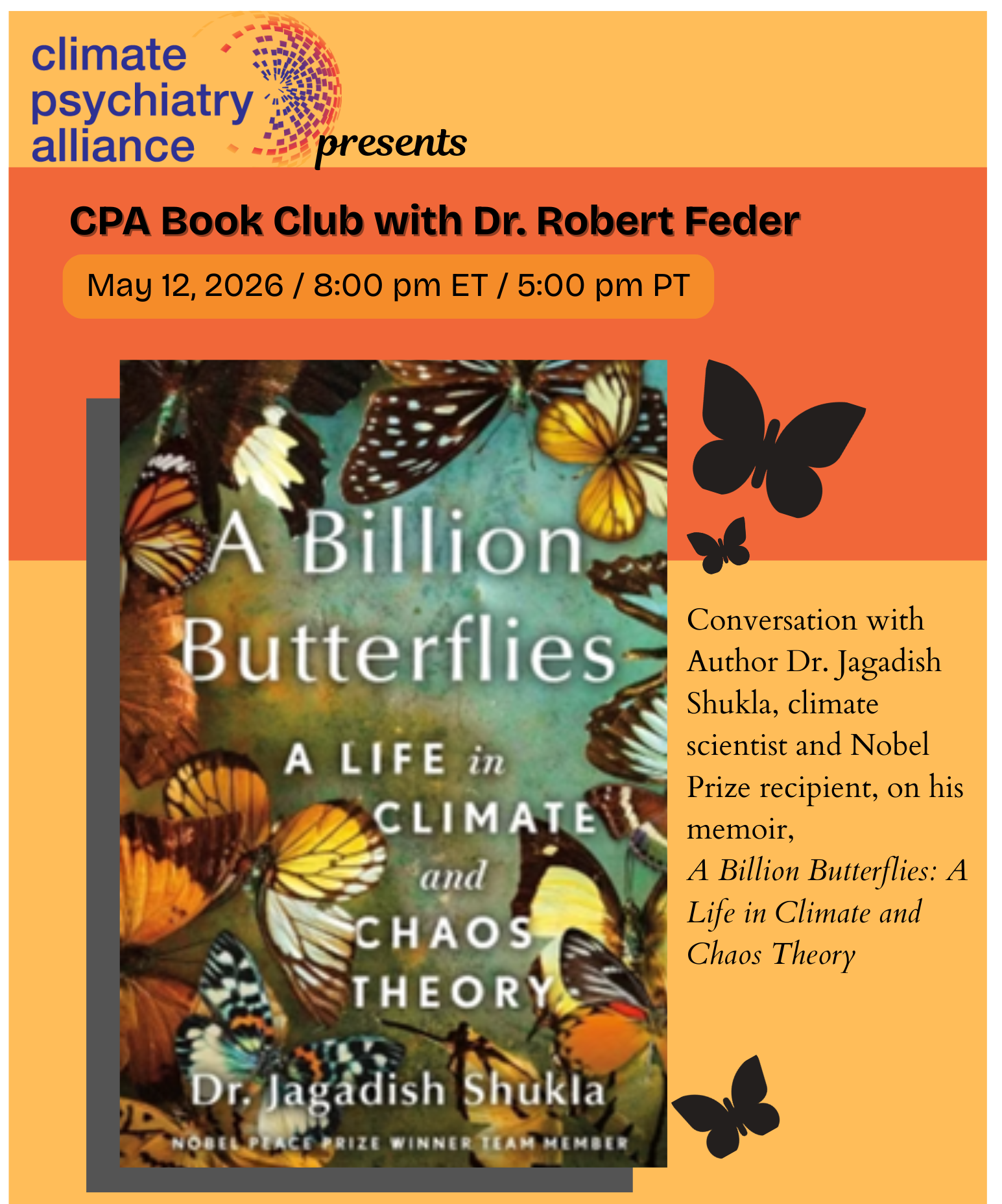 Join the Climate Psychiatry Alliance for a conversation with climate scientist, Nobel Prize winner, and author Dr. Jagadish Shukla about his memoir, A Billion Butterflies: A Life in Climate and Chaos Theory.