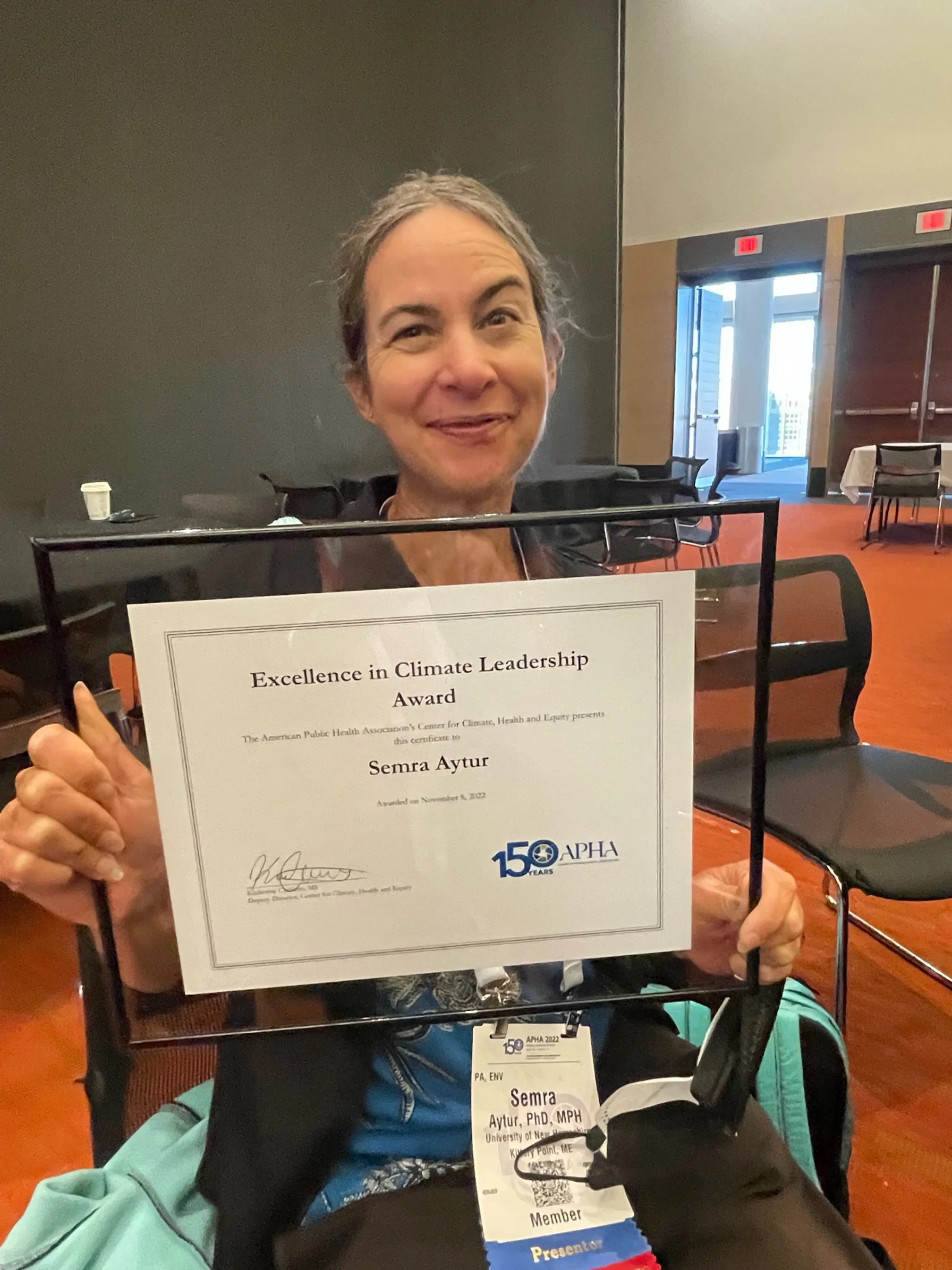 Dr. Semra Aytur, member of the Advisory Board and Co-Chair of the Climate Justice Working Group, gave the keynote address about planetary health and transformational resilience, and Dr Bob Friedlander, Chair, BOD, received the Friend of Public Health Award.